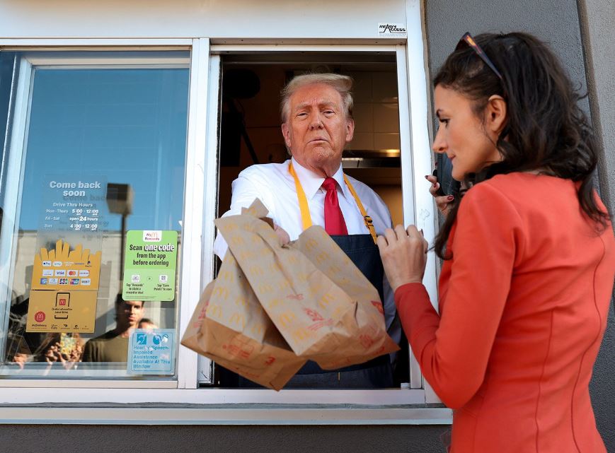 مع بقاء أكثر من أسبوعين فقط على موعد الانتخابات الرئاسية، المرشح الجمهوري دونالد ترامب يعمل كعامل في مطعم "ماكدونالدز" في محاولة لجذب الناخبين في ولاية بنسلفانيا المتأرجحة.