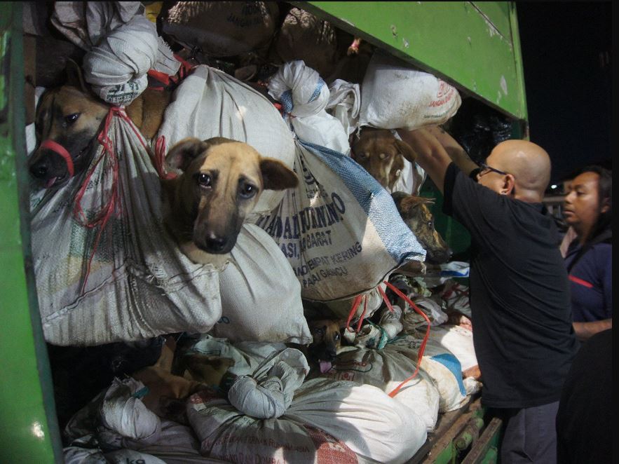 ناشطون في إندونيسيا ينقذون المئات من الكلاب المعدّة للاستهلاك البشري بعد أن صادرت الشرطة شاحنة تحتوي على هذه الحيوانات. ويحاول الناشطون في البلاد حظر تجارة لحوم الكلاب والقطط.