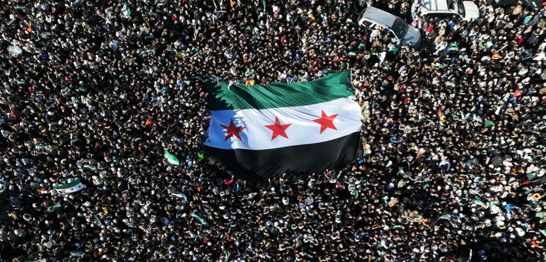 - حشود من السوريين يرفعون علماً عملاقاً من عهد الاستقلال في ساحة الأمويين في دمشق في 13 كانون الأوّل.