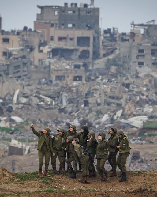مجندات إسرائيليات يلتقطن صورة سيلفي في جنوب إسرائيل، بالقرب من الحدود مع غزة، في 19 شباط. بلغ عدد القتلى في غزة في ذلك الوقت 29,000 شخص.