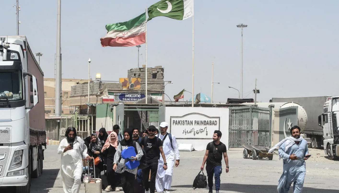 طلاب باكستانيون يعبرون الحدود الباكستانية الإيرانية بعد عودتهم من إيران في تفتان، بمقاطعة بلوشستان، وسط الصراع المستمر بين إسرائيل وإيران، (ا ف ب).