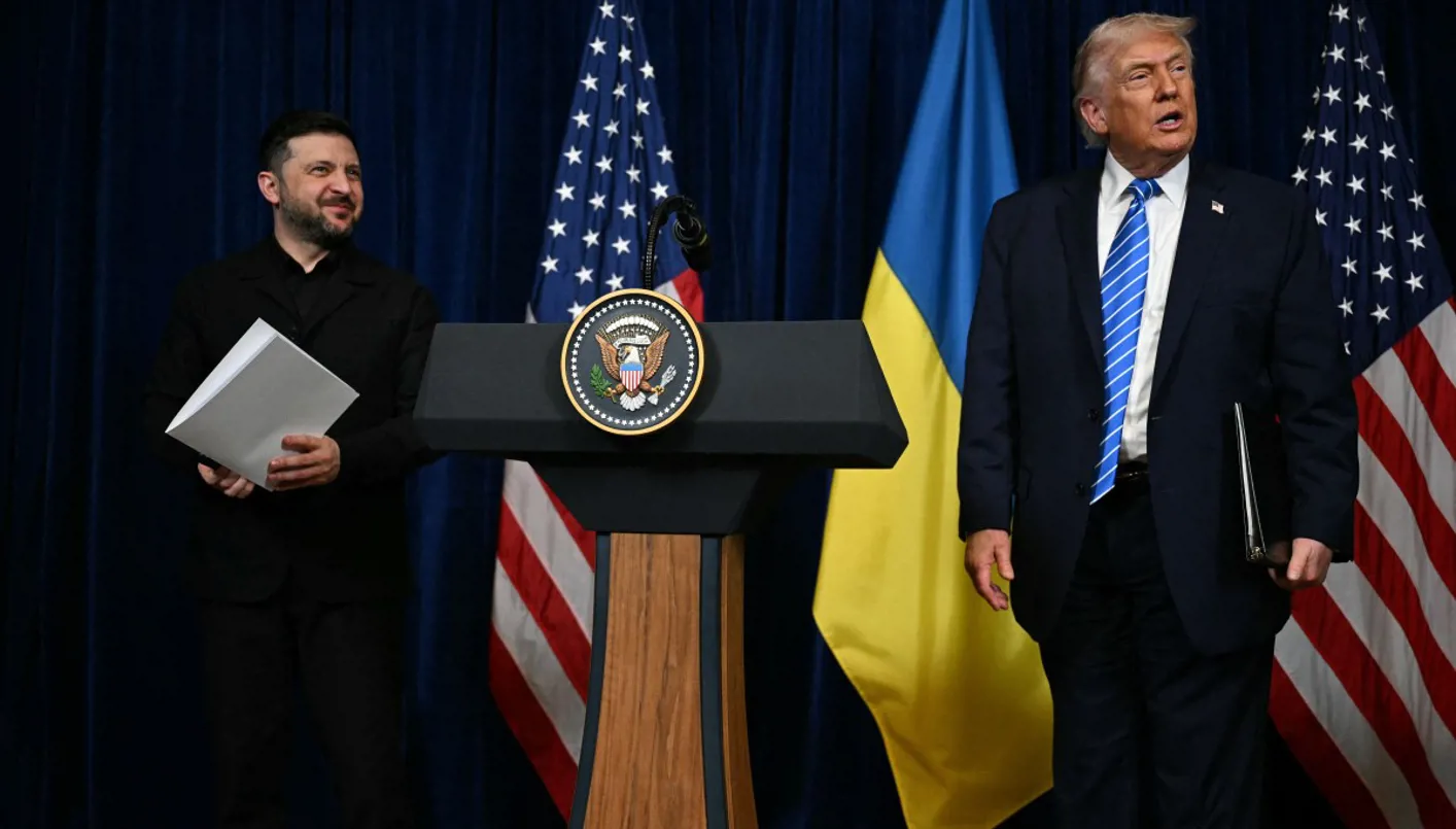 الرئيسان ترامب وزيلينسكي في مؤتمر صحافي مشترك بعد المحادثات في فلوريدا (أ ف ب).