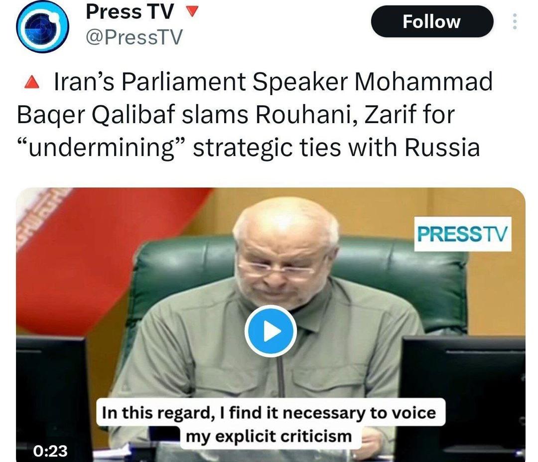 ففي جلسة علنية للمجلس، يوم الأحد 26 تشرين الأول/أكتوبر الجاري، وجّه قاليباف انتقادات لاذعة إلى روحاني، الذي تولّى رئاسة الجمهورية بين عامي 2013 و2021، وإلى ظريف، الذي شغل منصب وزير الخارجية خلال الفترة نفسها، متّهماً إياهما بأن مواقفهما ألحقت ضرراً بالعلاقات الاستراتيجية المتنامية بين طهران وموسكو.