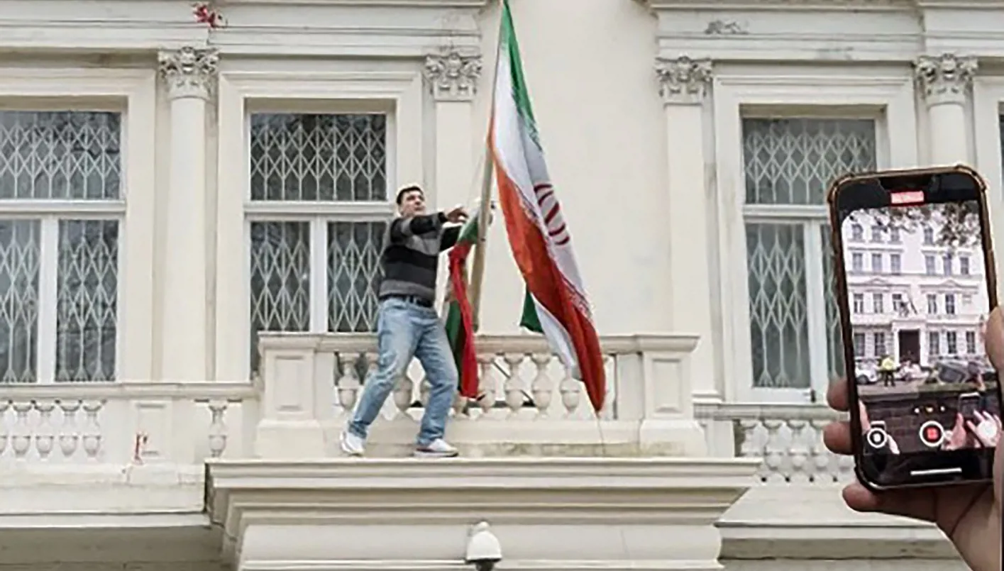 متظاهر يستبدل علم إيران الحالي بعلم ما قبل الثورة على مبنى السفارة في لندن