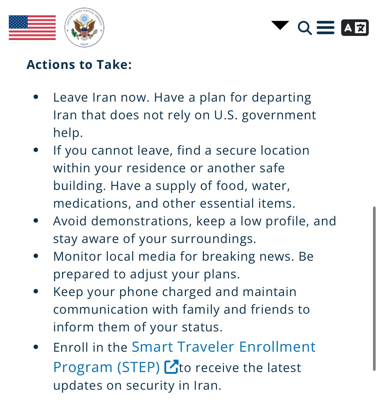 كما أشار إلى أن على المواطنين الأميركيين الموجودين في إيران، إذا كان ذلك آمناً، التفكير بمغادرة البلاد براً عبر أرمينيا أو تركيا. وشدّد التنبيه على أن حاملي الجنسيتين الأميركية والإيرانية ملزمون بمغادرة إيران باستخدام جوازات سفر إيرانية، نظراً لأن السلطات الإيرانية لا تعترف بازدواج الجنسية.