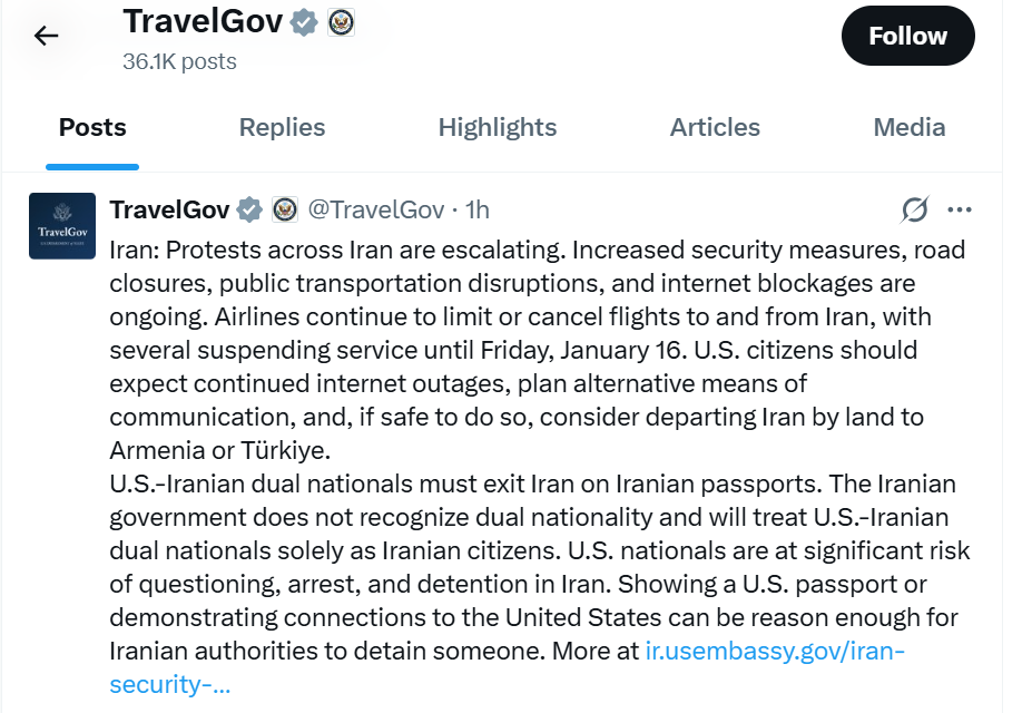 نشر الحساب الرسمي لقسم الشؤون القنصلية الأميركية تنبيهاً أمنياً حذّر فيه من تصاعد الاحتجاجات في مختلف أنحاء إيران، وما يرافقها من إجراءات أمنية مشددة، شملت إغلاق طرق، وتعطيل وسائل النقل العام، إضافة إلى استمرار حجب الإنترنت.