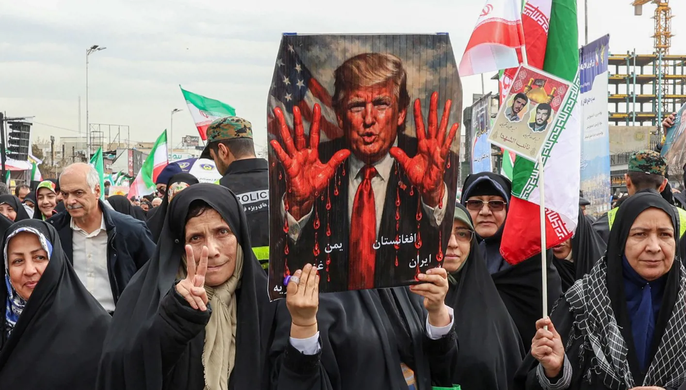 سيدات يحملن لافتة تصوّر الرئيس الأميركي دونالد ترامب بأيدي ملطخة بالدماء خلال مسيرة في طهران، 11 شباط 2026. (أ ف ب)
