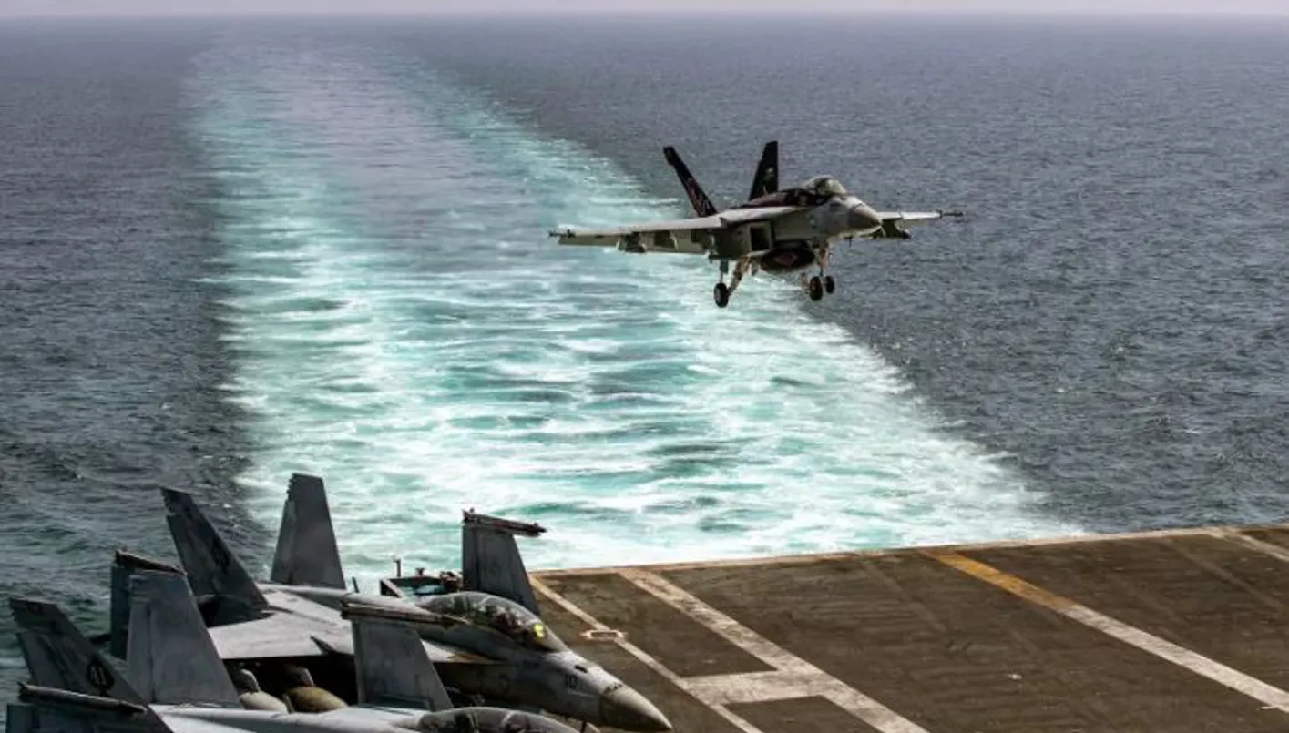 طائرة F/A-18E تهبط على سطح حاملة الطائرات "إبراهام لينكولن"، (البحرية الأميركية).