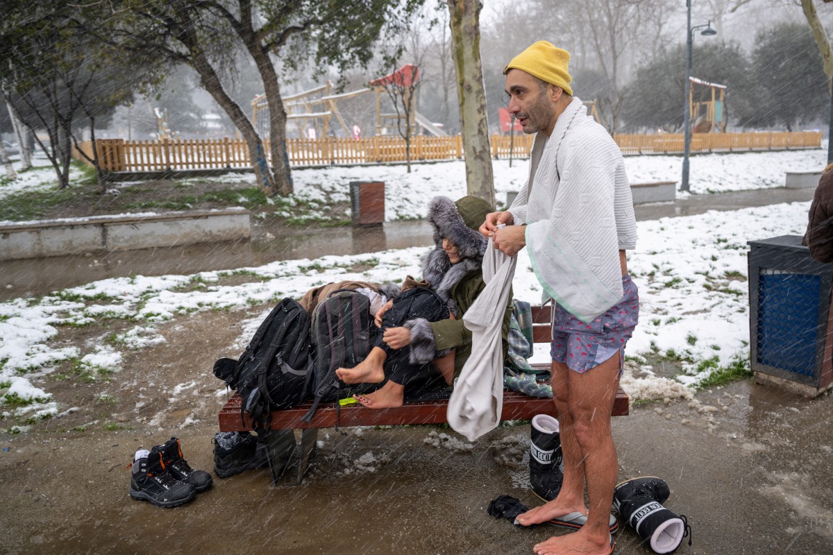 وكان إيرِن تور، أحد رواد المكان الدائمين، من بين أول الواصلين عند التاسعة من صباح السبت، وأحضر معه مكبّر صوت لتوفير أجواء موسيقية، وكان السبّاق إلى التحرّر من كنزته الصوفية تأهبا للغوص في المياه الرمادية.