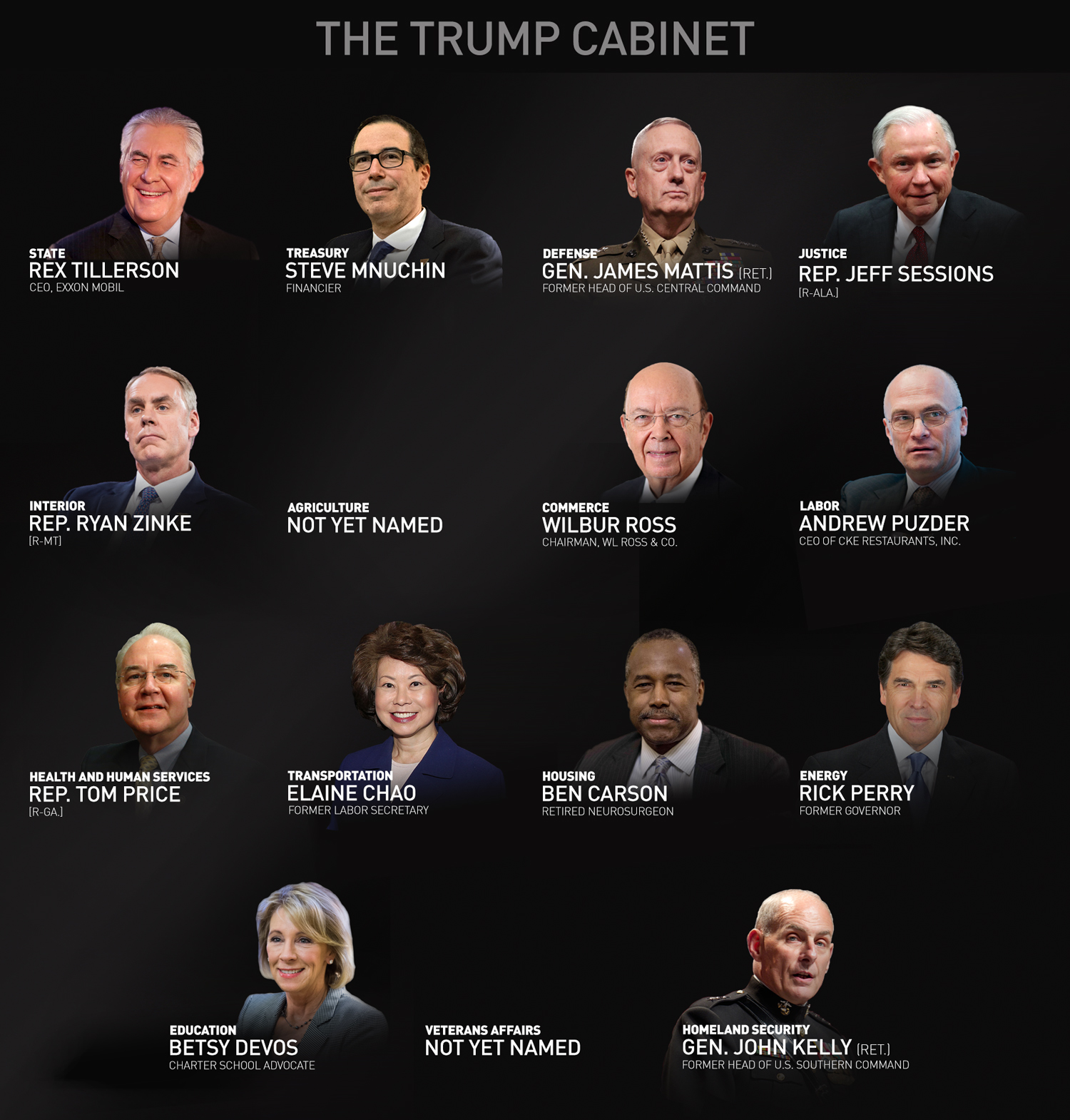 وفيما يلي أسماء من اختارهم ترامب لشغل بعض المناصب الرئيسية في البلاد، ومن بينها الدفاع والمخابرات والصحة والديبلوماسية والتجارة والعدالة والهجرة وصنع السياسات الاقتصادية.