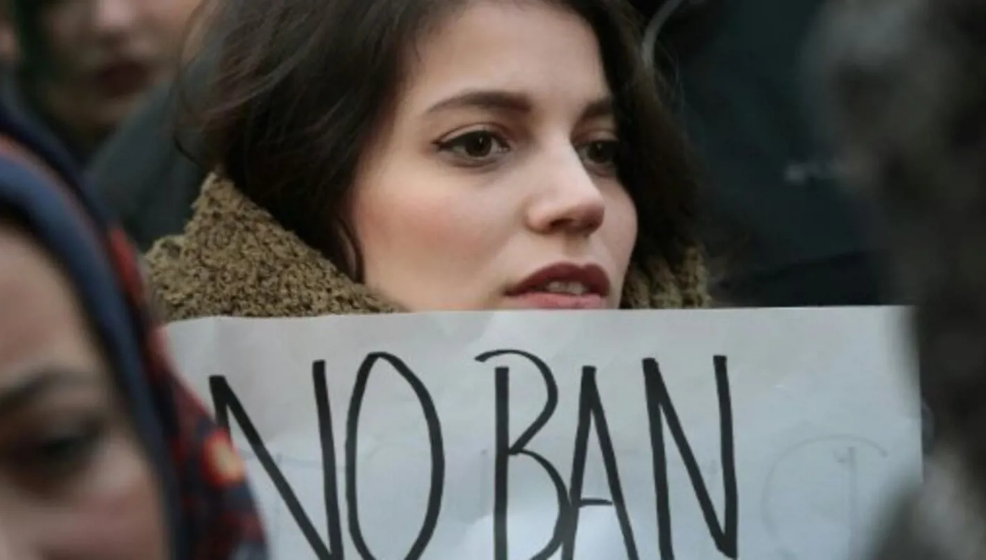 متظاهرة ضد منع السفر الى الولايات المتحدة
