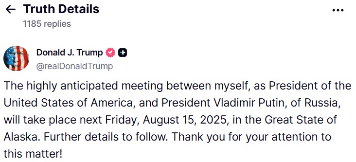 وكتب ترامب على منصته "تروث سوشيال" أن "الاجتماع المرتقب بيني، بصفتي رئيساً للولايات المتحدة الأميركية، والرئيس الروسي فلاديمير بوتين، سيعقد الجمعة المقبل في 15 آب/أغسطس 2025 في ولاية ألاسكا". ولم يلتق ترامب مع بوتين شخصياً منذ عودته إلى البيت الأبيض في كانون الثاني/يناير.
