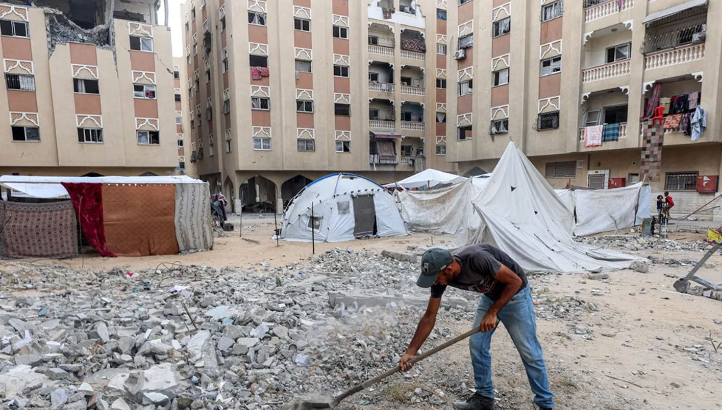 رجل ينظف الأنقاض بالقرب من الخيام التي تأوي الفلسطينيين النازحين (أ ف ب)