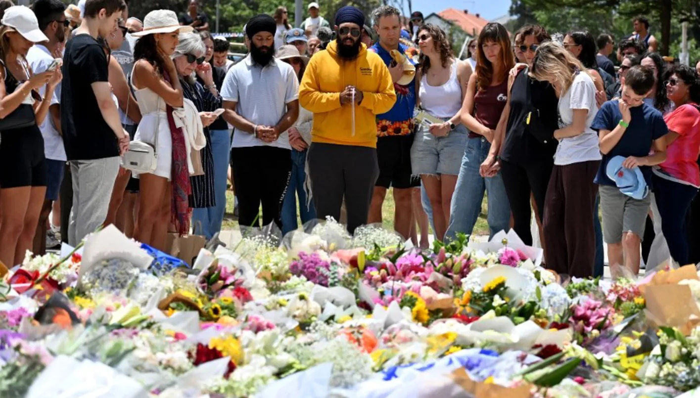 زهور وعلم أسترالي موضوعة تكريماً لضحايا حادث إطلاق النار في شاطئ بوندي. (أ ف ب)