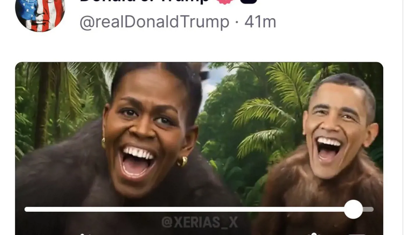 وفي ختام المقطع الذي يُروّج لنظريات مؤامرة بشأن خسارة ترامب انتخابات 2020 لصالح جو بايدن، يظهر وجها أوباما وزوجته ميشيل على مجسّمَي قردَين لثانية تقريباً.