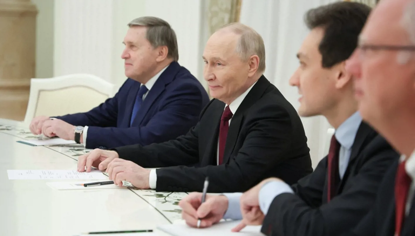 رئيس روسيا فلاديمير بوتين خلال اجتماع مع المبعوث الخاص الأميركي ستيف ويتكوف وصهر الرئيس الأميركي دونالد ترامب جاريد كوشنر (غير ظاهرين في الصورة) في الكرملين (أ ف ب)