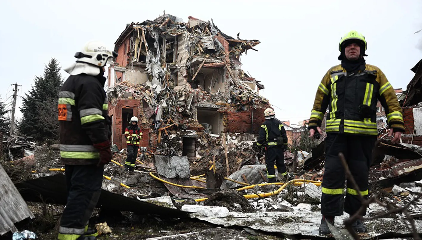 رجال إنقاذ أوكرانيون يعملون في موقع منزل متضرر بشدة جراء غارة جوية في كييف، (أ ف ب).