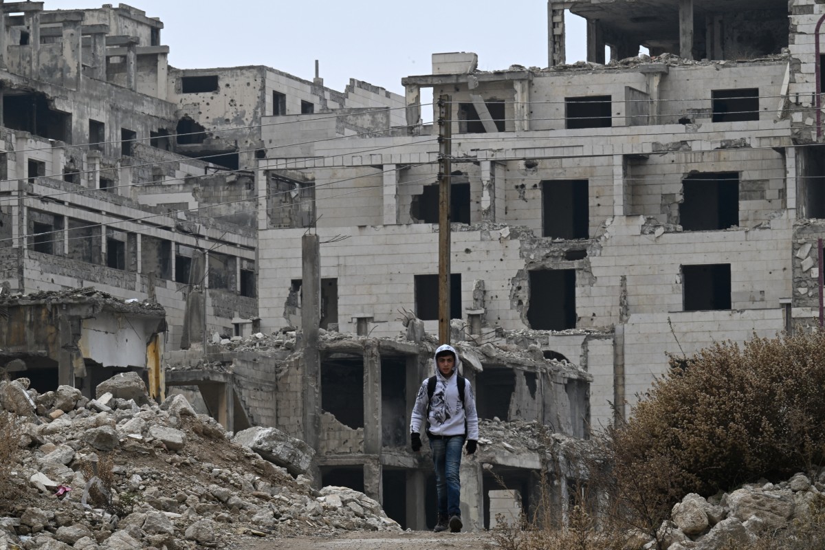 صبي يمر بين أنقاض المباني في حي الخالدية بحمص (10 شباط 2025، أ ف ب).