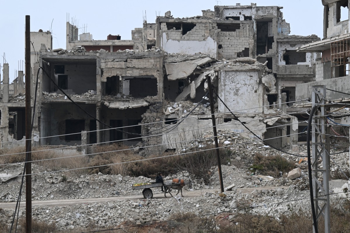 طفل يمر بعربة يجرها حمار وسط أنقاض ابنية في حي الخالدية بحمص (10 شباط 2025، أ ف ب).