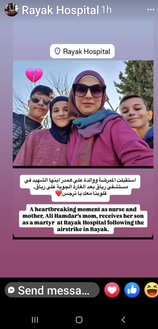 في المقابل شهد مستشفى رياق العام مأساة إستقبال رئيسة التمريض في قسم الطوارىء ضحايا الغارة، لتحمل بين يديها إبنها علي شهيداً. 5 ضحايا، بينهم ثلاثة أطفال، و16 جريحاً سقطوا جراء الغارة، بحسب مركز عمليات طوارىء الصحة العامة التابع لوزارة الصحة، فيما كانت اعمال رفع أنقاض المبنى لا تزال جارية.