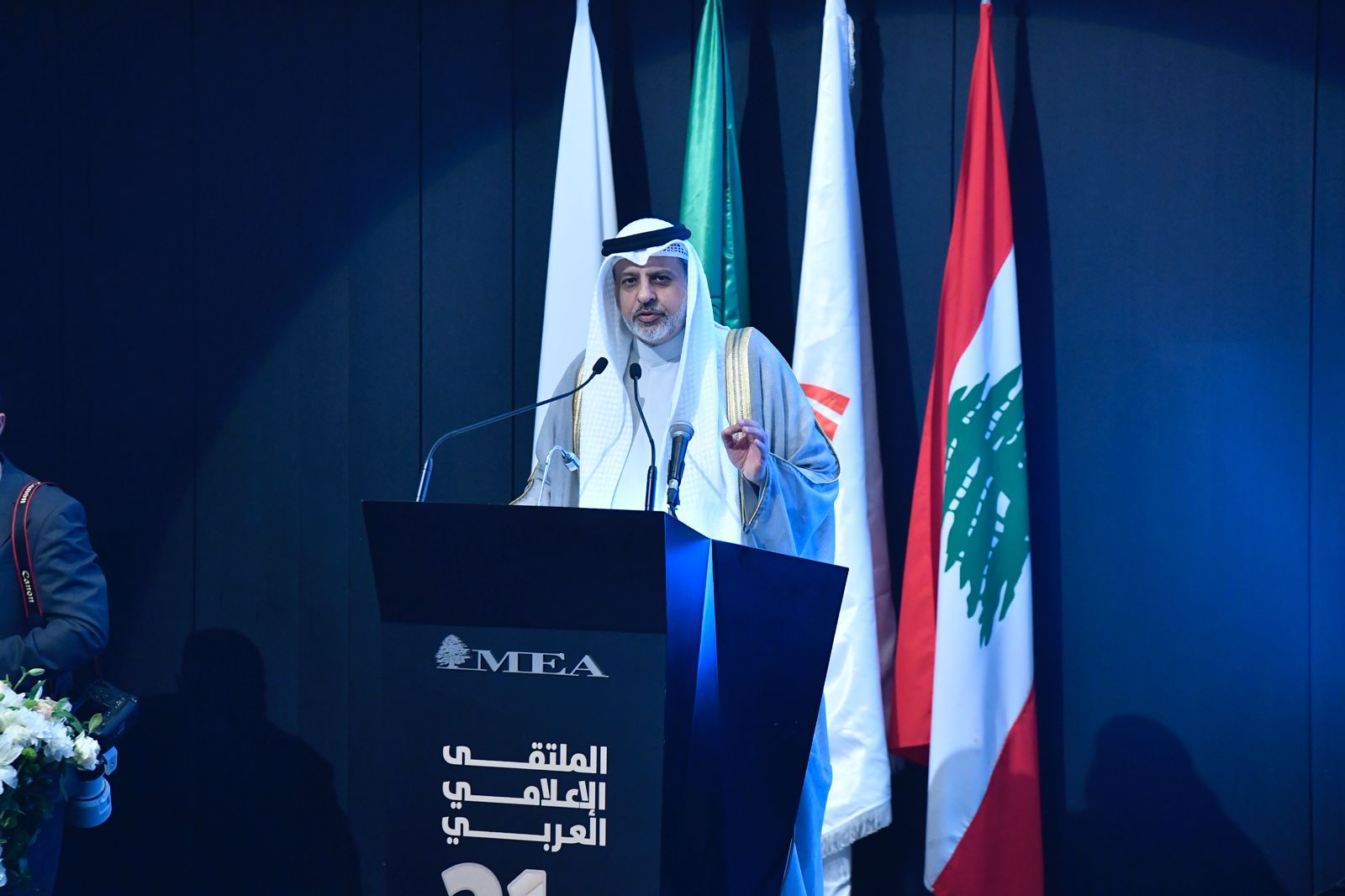 وقال: "يسعدني في البداية أن أتوجّه بالشكر والتقدير الى فخامة الرئيس العماد جوزف عون على رعايته وحضوره هذا الملتقى المهم، وهو ما يعكس اهتماماً أصيلاً بالإعلام ودوره في أن يكون جسر التواصل بين المسؤولين والمواطنين في عملية التنمية الشاملة. كما أتوجّه بالشكر إلى معالي الدكتور بول مرقص، وزير الإعلام في الجمهورية اللبنانية، على الدعوة الكريمة للمشاركة معكم اليوم في الدورة الحادية والعشرين للملتقى الإعلامي العربي، في حضور هذه الكوكبة المتميزة من رجال الفكر والسياسة والإعلام والثقافة والفن من مختلف الدول العربية... هنا في بيروت، بكل ما تملكه من مقومات بشرية وحضارية، تركت بصماتها عبر الأجيال. وأغتنم هذه المناسبة لأحيي الجهود الطيبة التي تبذلها هيئة الملتقى الإعلامي العربي، وأمينه العام السيد ماضي الخميس، الشريك الأصيل في مسيرة الجامعة والملتقى منذ سنوات".