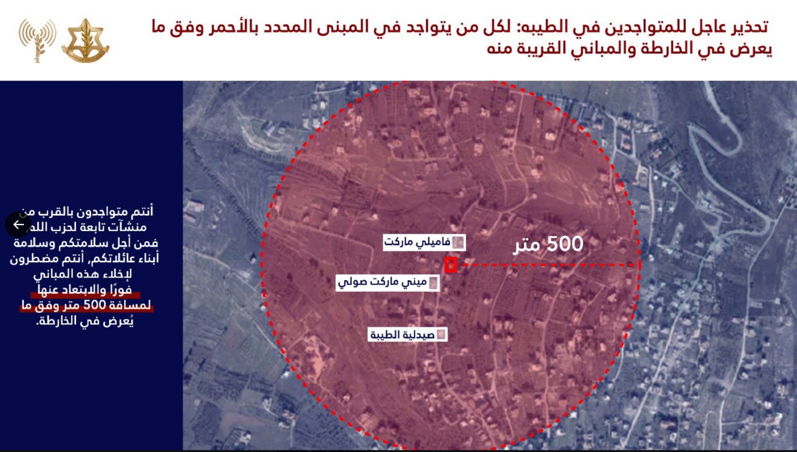 ووجّه الجيش الإسرائيلي إنذاراً إلى سكان تلك البلدات، قائلاً "سنهاجم بنى تحتية عسكرية تابعة لحزب الله".