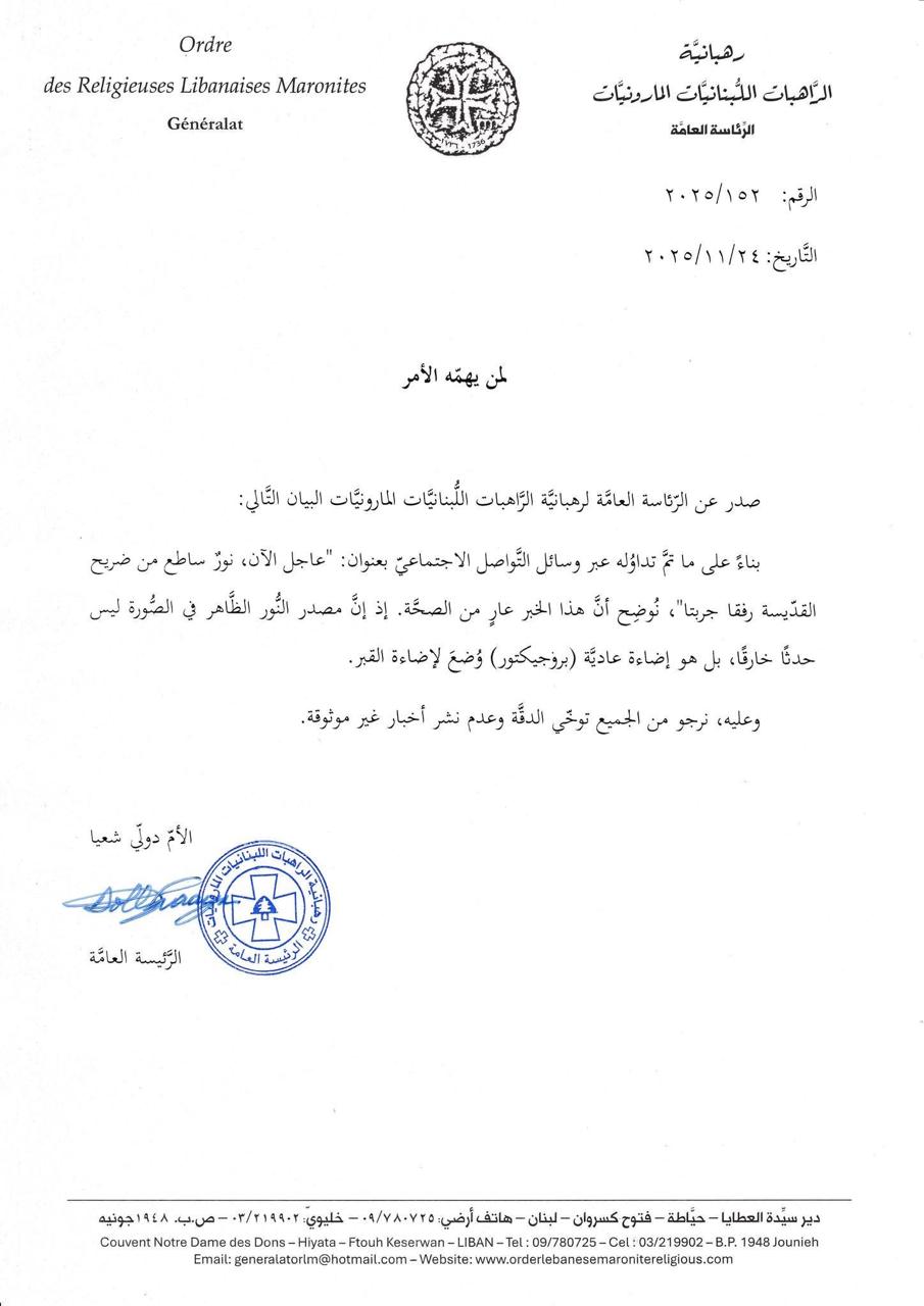 بعد تداول أنباء عن ظهور نور من قبر القدّيسة رفقا في جربتا، أوضح دير مار يوسف حيث يقع الضريح أن ما يتم تداوله غير دقيق. وأكد الدير أن النور ناجم عن جهاز بروجيكتور مُثبت في المكان، ولا علاقة له بأي ظاهرة استثنائية.