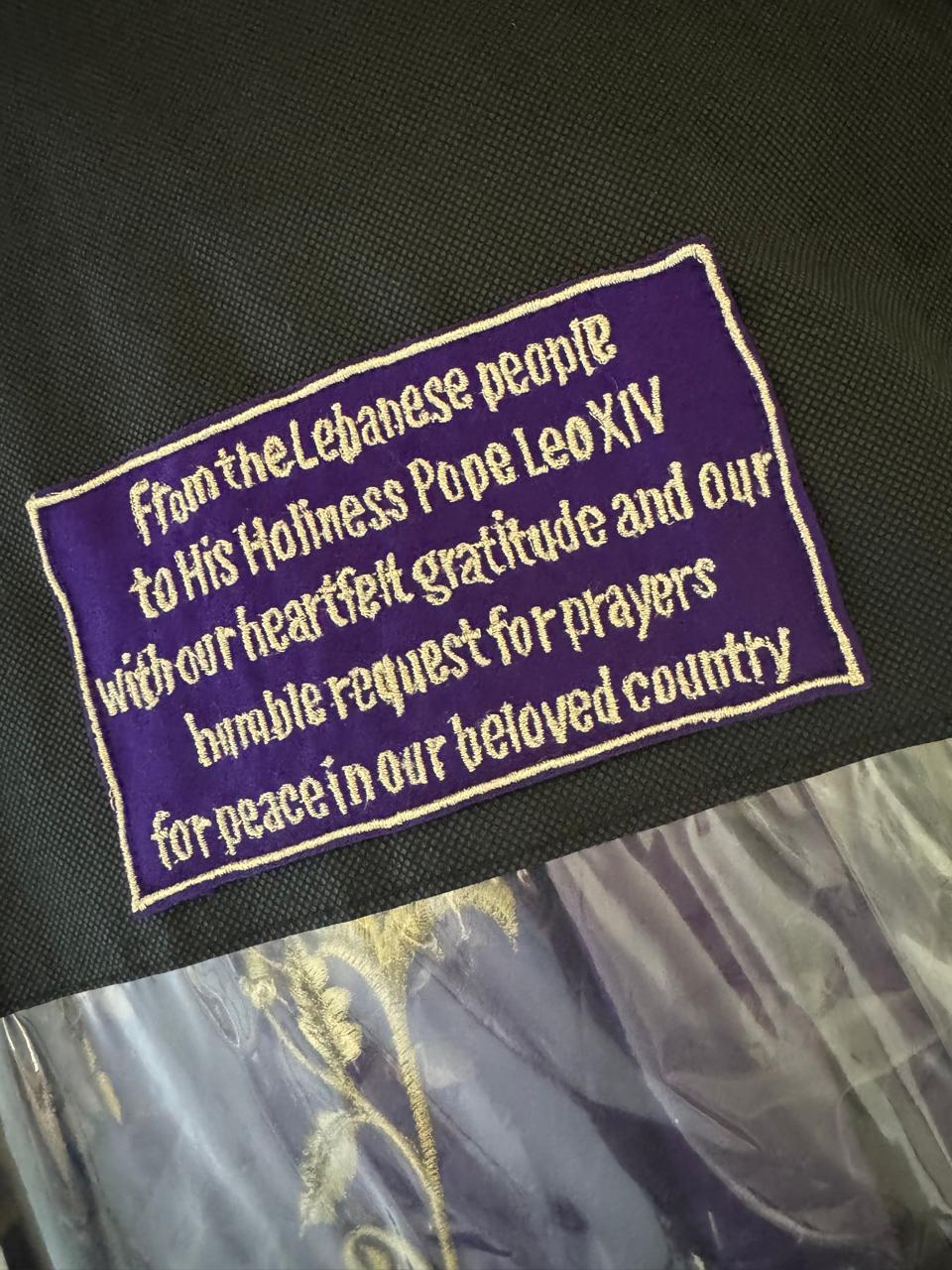 وفي القداس الاحتفالي في بيروت، سيرتدي البابا ثوباً ليتورجياً بنفسجياً من تصميم بوطانوس أيضاً، تتوسطه زخرفة صليب من الموزاييك مستوحاة من الفن البيزنطي والسرياني في القرون المسيحية الأولى، وتحيط به أغصان الأرز والزيتون والسنديان: