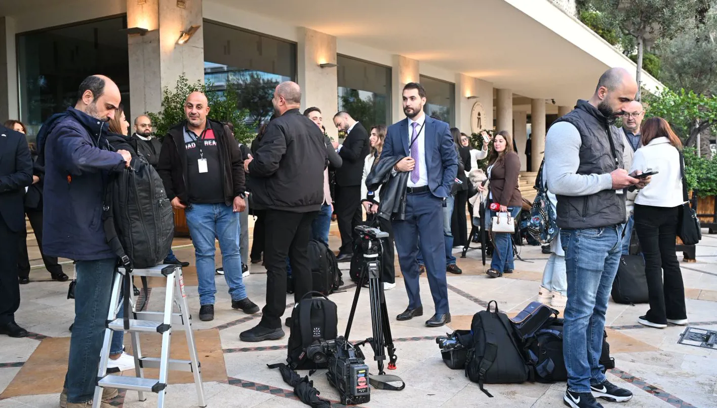 الصحافيون ينتظرون إشارة الانطلاق إلى عنايا لمواكبة زيارة البابا لاوون (بعدسة حسام شبارو).