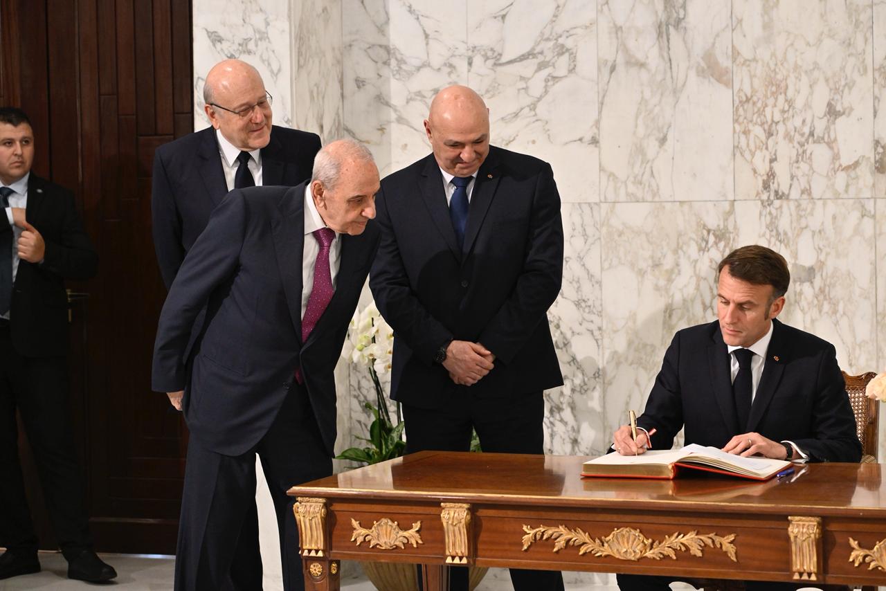 الرئيس الفرنسي إيمانويل ماكرون يدوّن رسالته في سجل قصر بعبدا