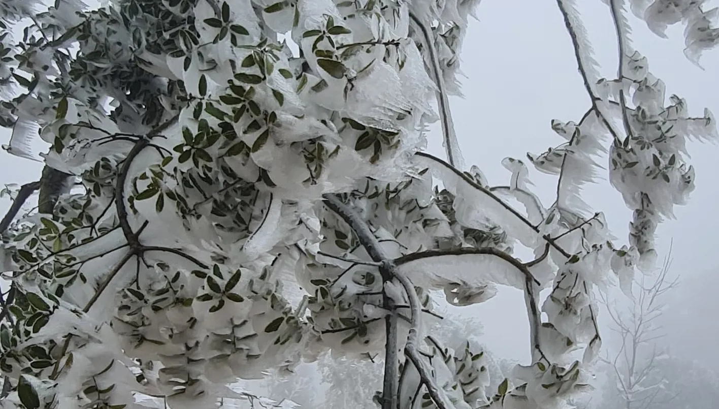 وحوَّلت الرياح الشرقية الباردة الأمطار إلى لوحات جليدية على أغصان الاشجار والنباتات وأعمدة الكهرباء. كما سيطر الضباب على المشهد العام لهذه المنطقة الداخلية الجبلية.