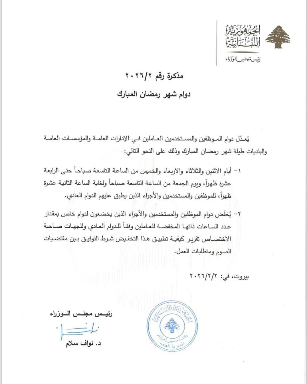 أصدر رئيس مجلس الوزراء نواف سلام مذكرة حملت الرقم 2/2026، تتعلق بدوام شهر رمضان المبارك. وجاء فيها: