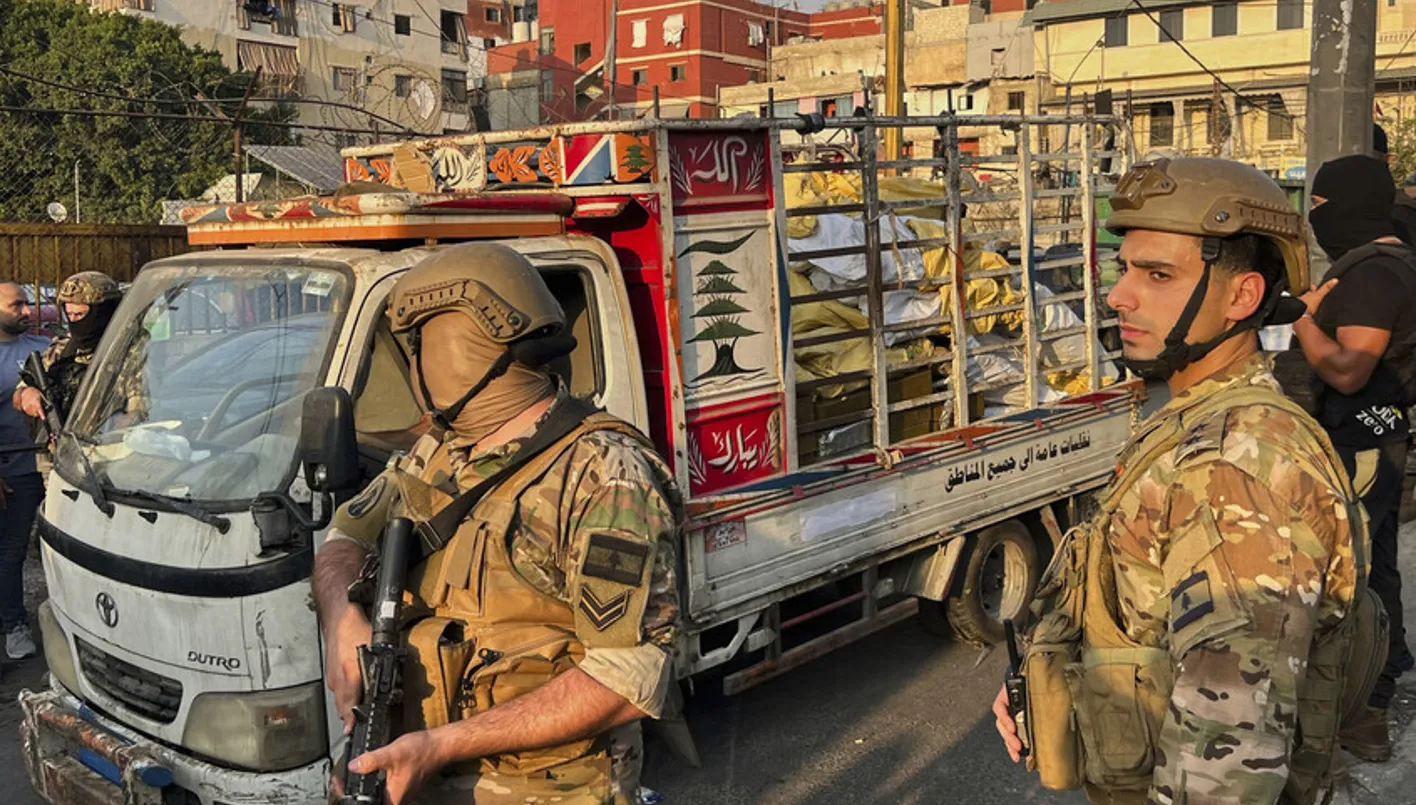 عناصر من الجيش يتسلمون أسلحة في احد المخيمات الفلسطينية في لبنان.
