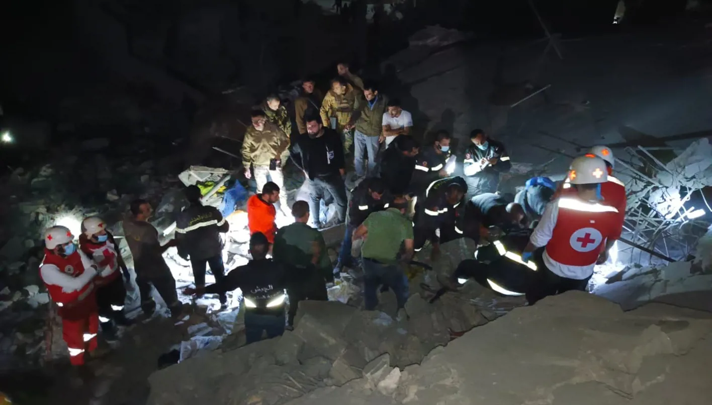 تواصل فرق الدفاع المدني والهيئات الصحية العمل على رفع أنقاض المبنى السكني الذي دمره مساء أمس الطيران الحربي الإسرائيلي في بلدة السكسكية