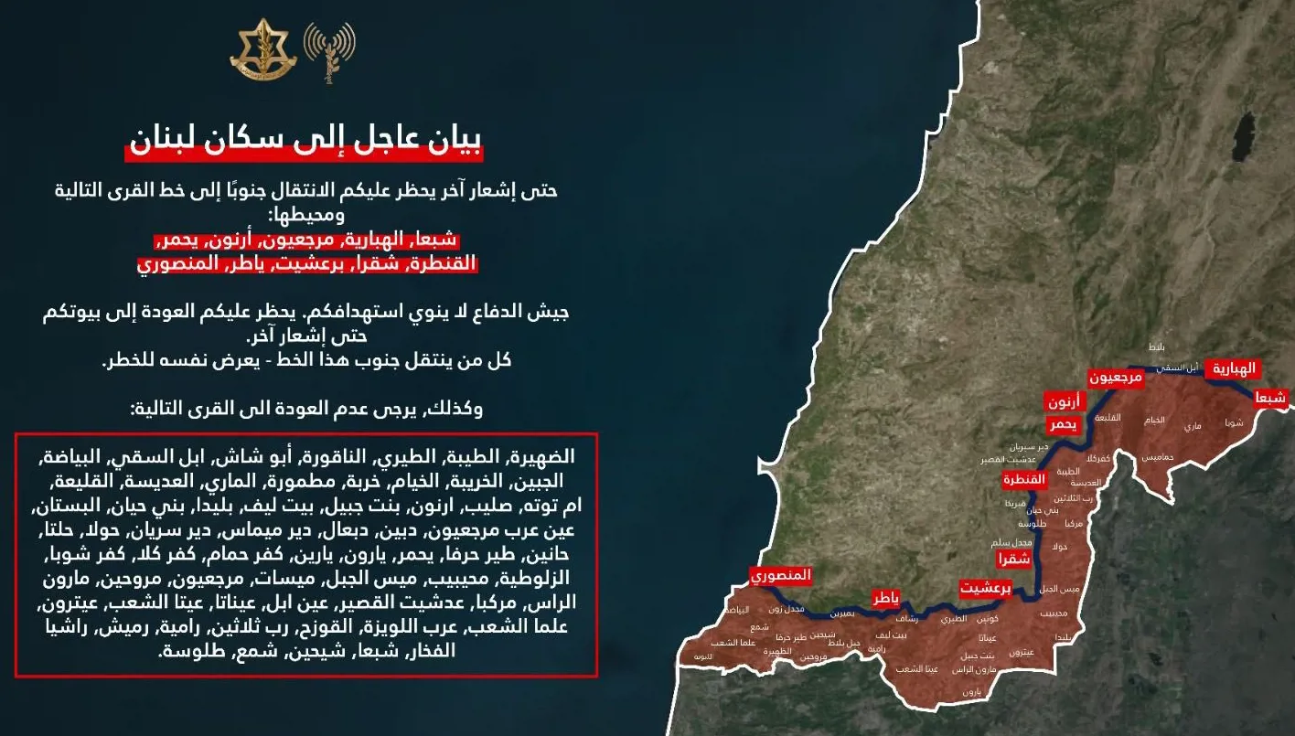 حذّر المتحدث باسم الجيش الإسرائيلي، أفيخاي أدرعي، سكّان جنوب لبنان من الانتقال إلى عدد من القرى حتى إشعار آخر.