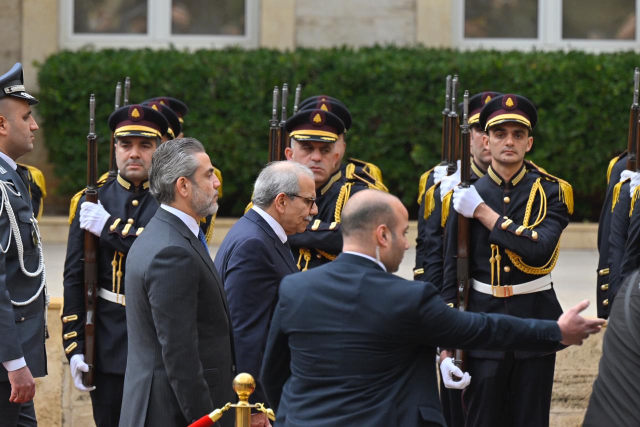 أقيمت لرئيس مجلس الوزراء اللبناني نواف سلام مراسم استقبال رسمية في الباحة الخارجية للسراي الحكومي، حيث كان في استقباله الأمين العام لمجلس الوزراء القاضي محمود مكية.