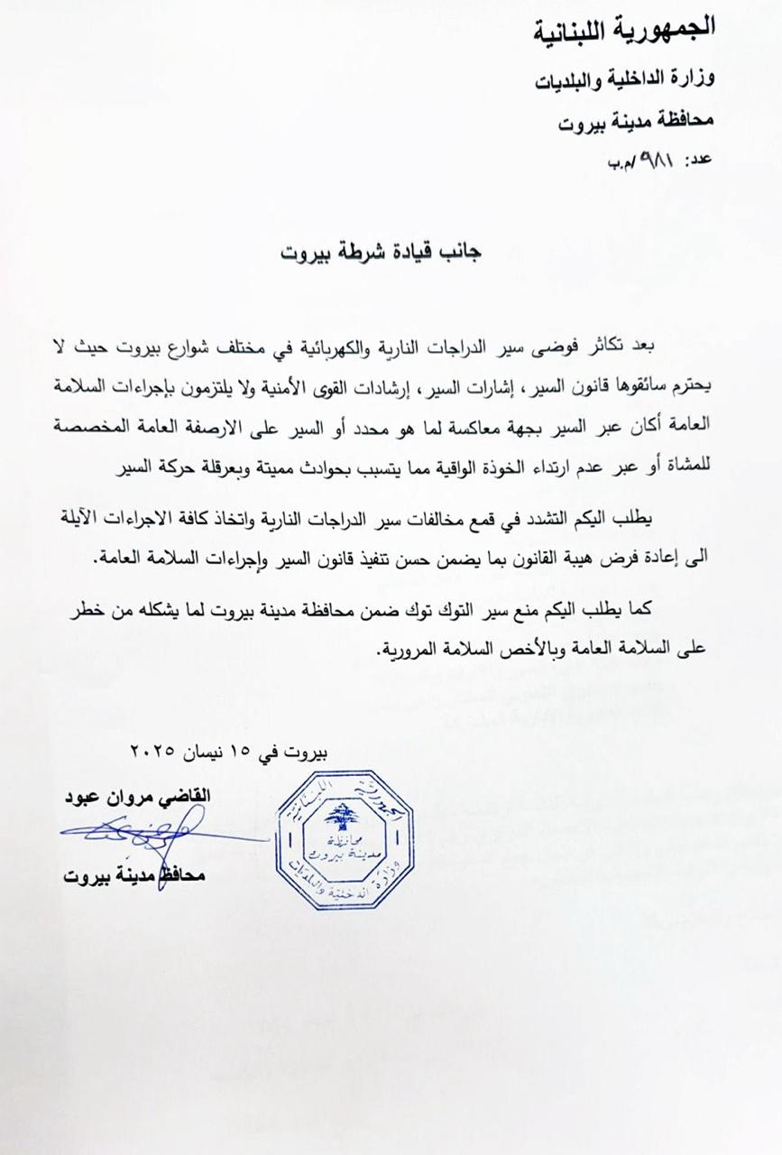 ووجه محافظ بيروت كتابا الى شرطة المدينة يطلب فيه التشدد في قمع المخالفات.