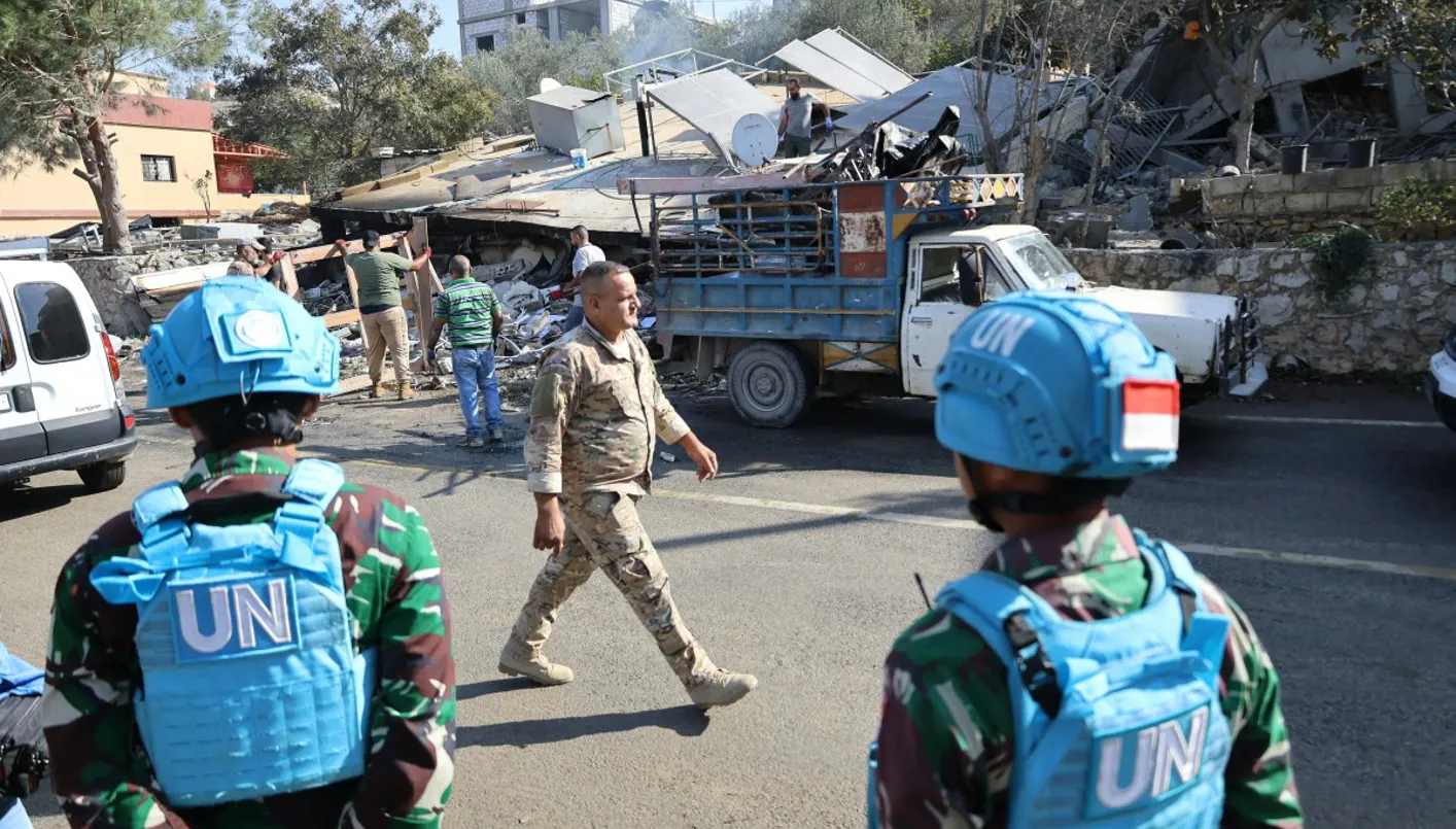 قوات اليونيفيل تنتشر أمام أحد المنازل المدمّرة في بلدة الطيبة بعد الغارات الإسرائيلية الأسبوع الماضي (أ ف ب).
