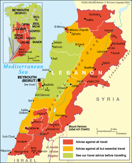 كما دعت الخارجية البريطانية إلى تجنّب التنقل إلا للضرورة القصوى إلى أجزاء واسعة من محافظة جبل لبنان، ولا سيما المناطق الواقعة جنوب خط يمتد من خيام الدامور مروراً بدير القمر وبيت الدين والباروك وصولاً إلى تخوم البقاع، مشيرة إلى أن هذه المناطق تشهد مخاطر أمنية متقلبة.