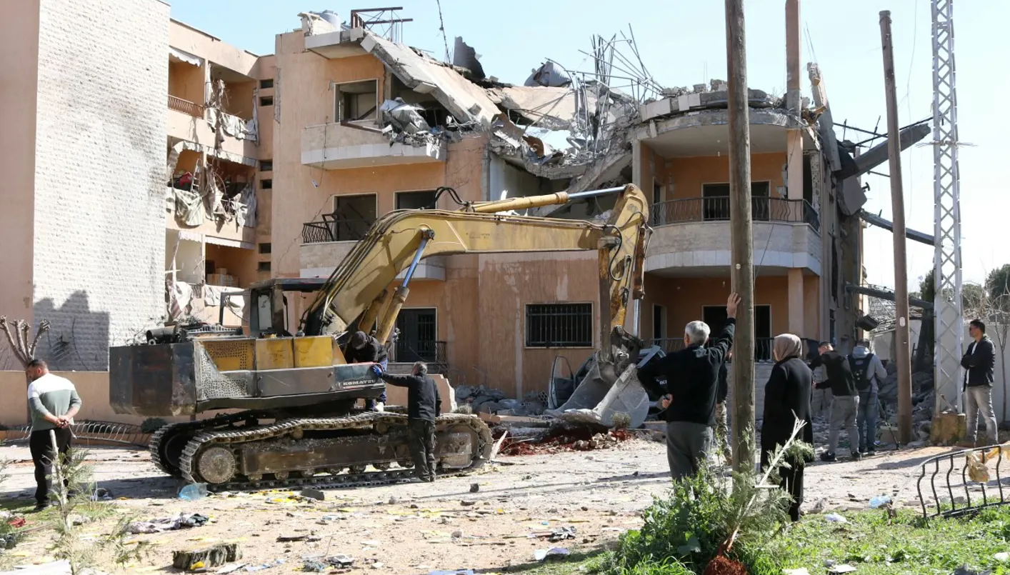 حفار يزيل الأنقاض أمام مبنى تعرض لأضرار بالغة في قرية علي النهري (أ ف ب)
