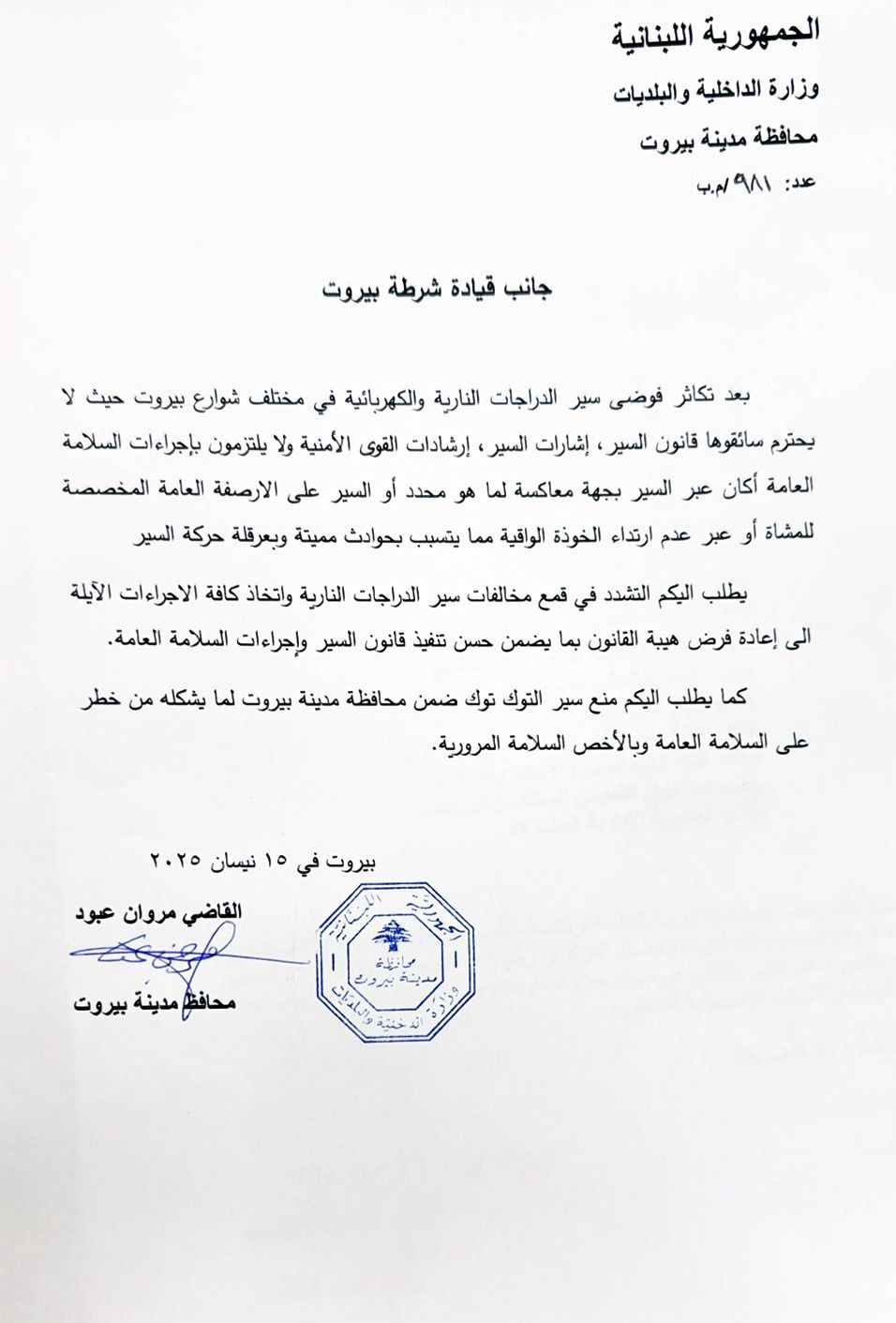 أصدرت دائرة العلاقات العامة في بلدية بيروت بياناً أعلنت فيه أن محافظ مدينة بيروت، مروان عبود، وجه كتاباً إلى قيادة شرطة بيروت في قوى الأمن الداخلي، دعا فيه إلى اتخاذ إجراءات صارمة للحد من الفوضى الناتجة عن سير الدراجات النارية والكهربائية في شوارع العاصمة.