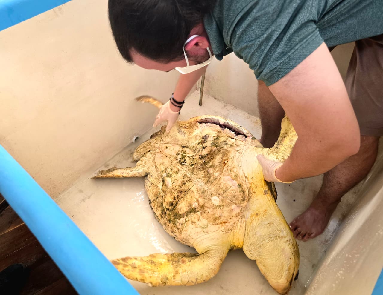 وأشرف مدير المحمية، الدكتور علي بدر الدين، بمشاركة الأخصائية المتطوعة في الإدارة الساحلية والبيئية الدكتورة رغدة سعد، على وضع السلحفاة في حوض خاص، حيث خضعت لفحص شامل لتحديد حجم الإصابة. وتم تنظيف الجرح وتعقيمه وتضميده باستخدام مراهم وعقاقير مخصّصة لمعالجة إصابات السلاحف البحرية.