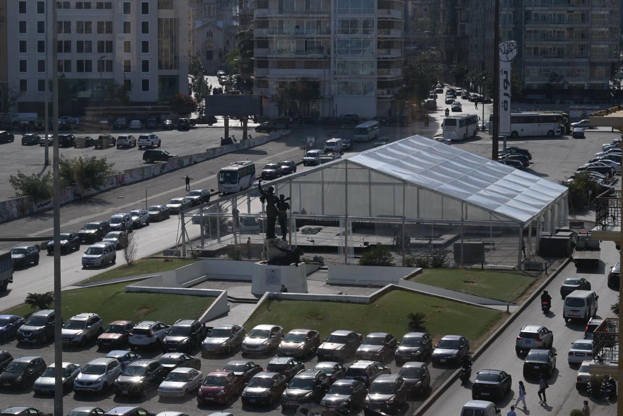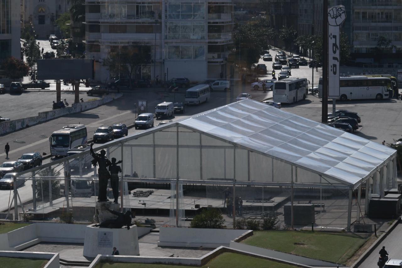 بالصور- نصب الخيمة التي سيلتقي فيها البابا رؤساء الطوائف الإسلامية في ساحة الشهداء