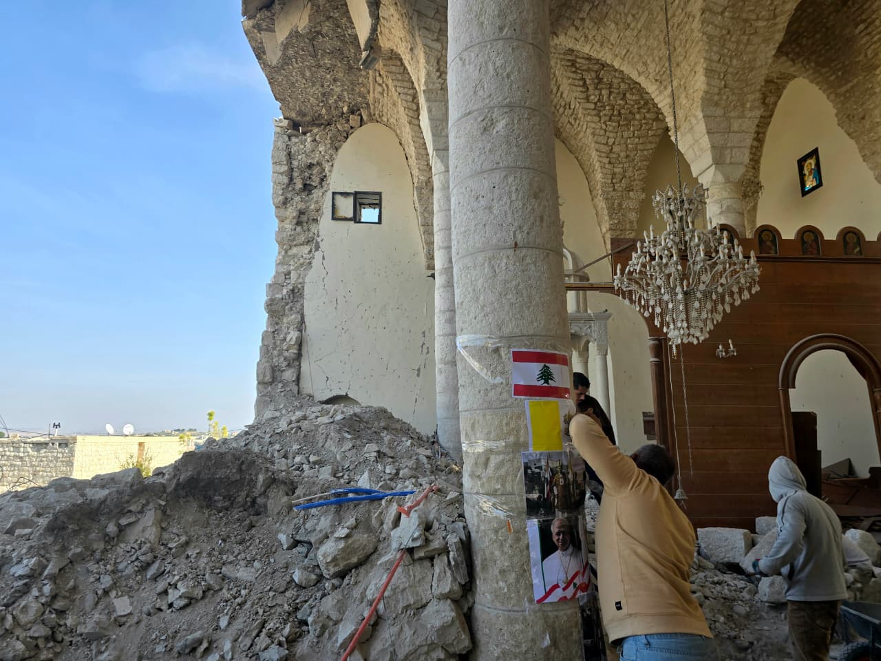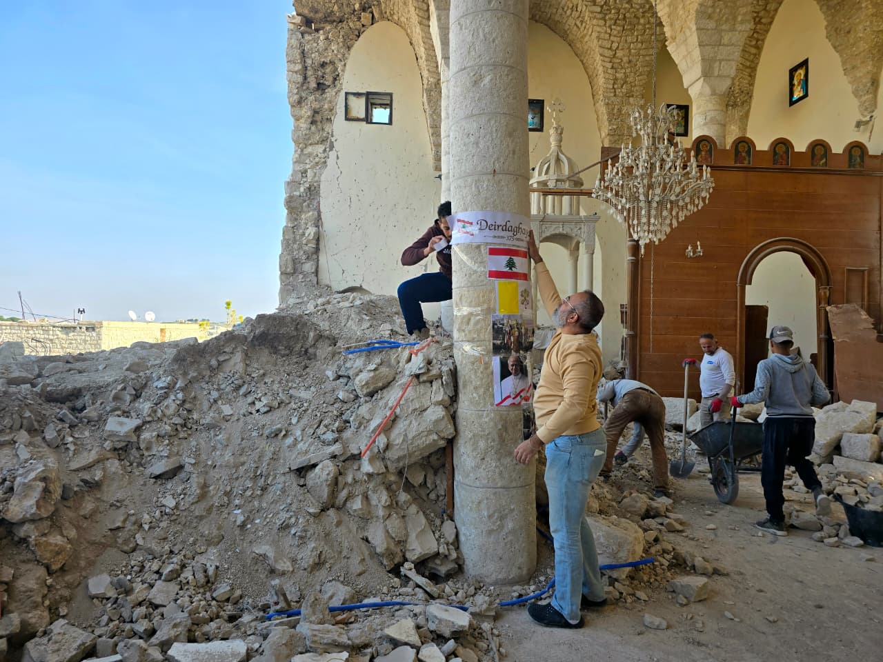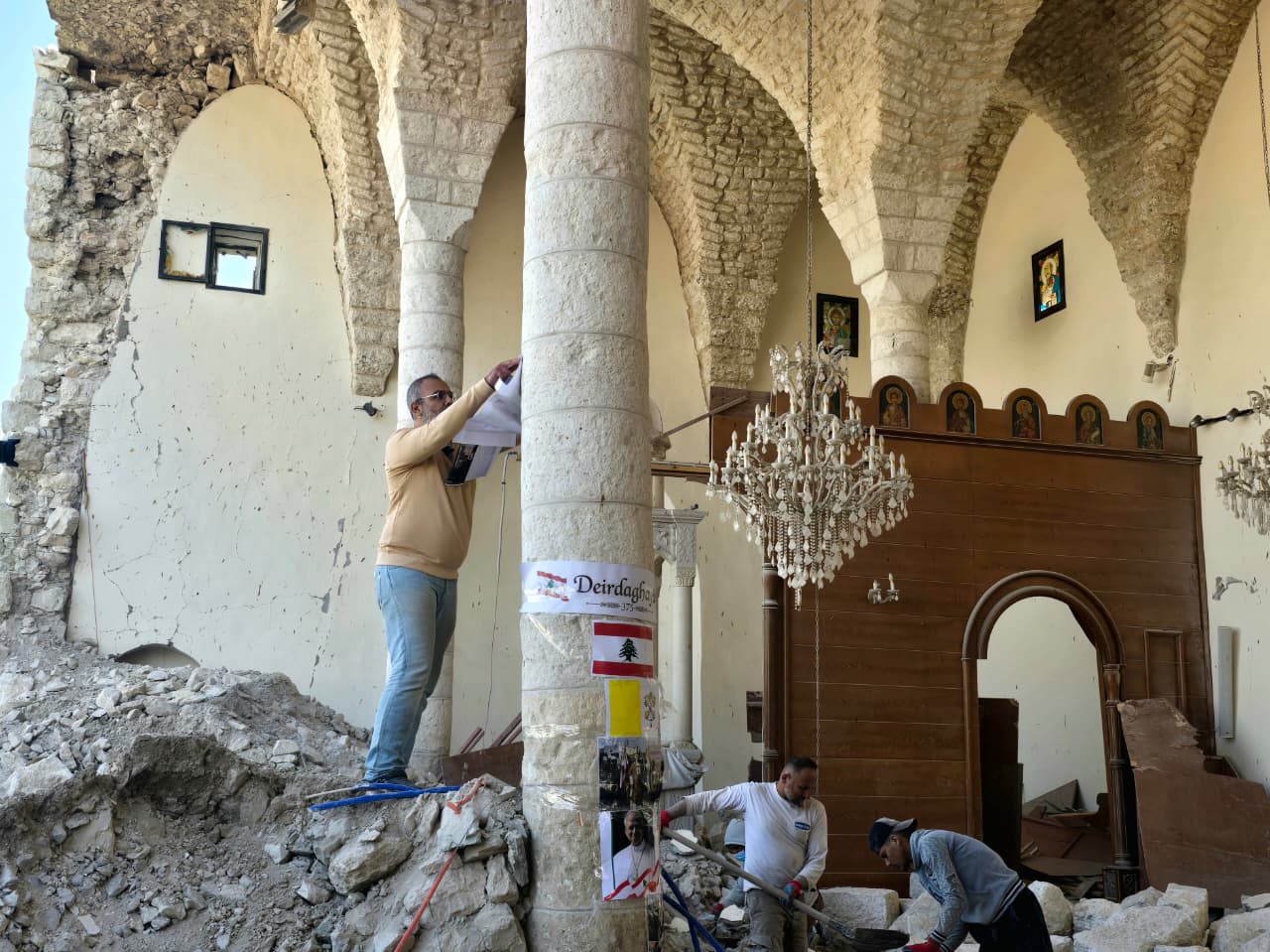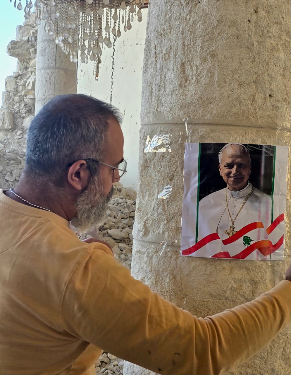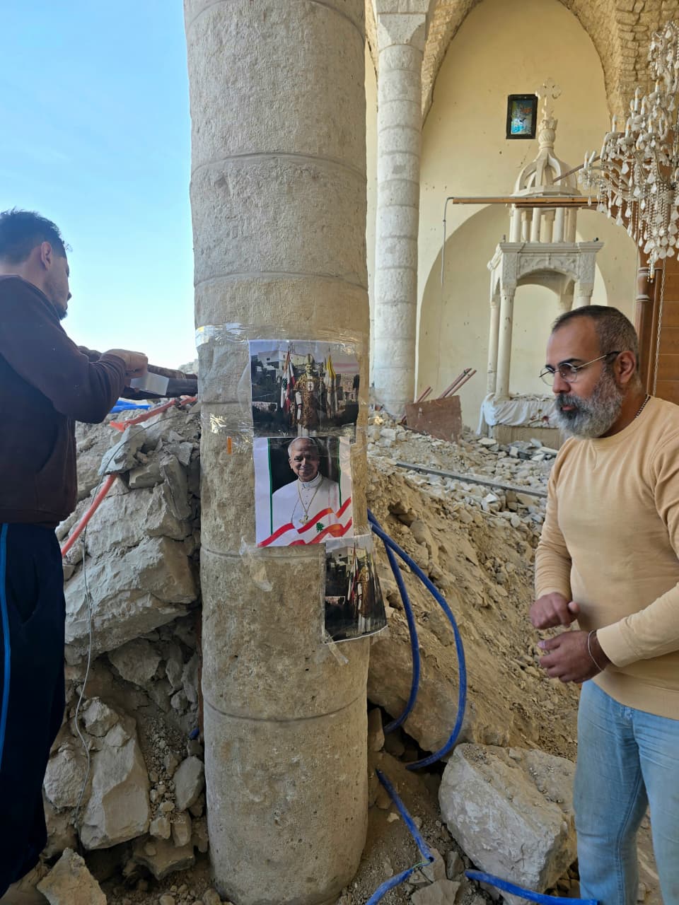 رفع صور البابا لاوون بين ركام كنيسة مار جاورجيوس في دردغيا جنوبي لبنان (فيديو وصور)