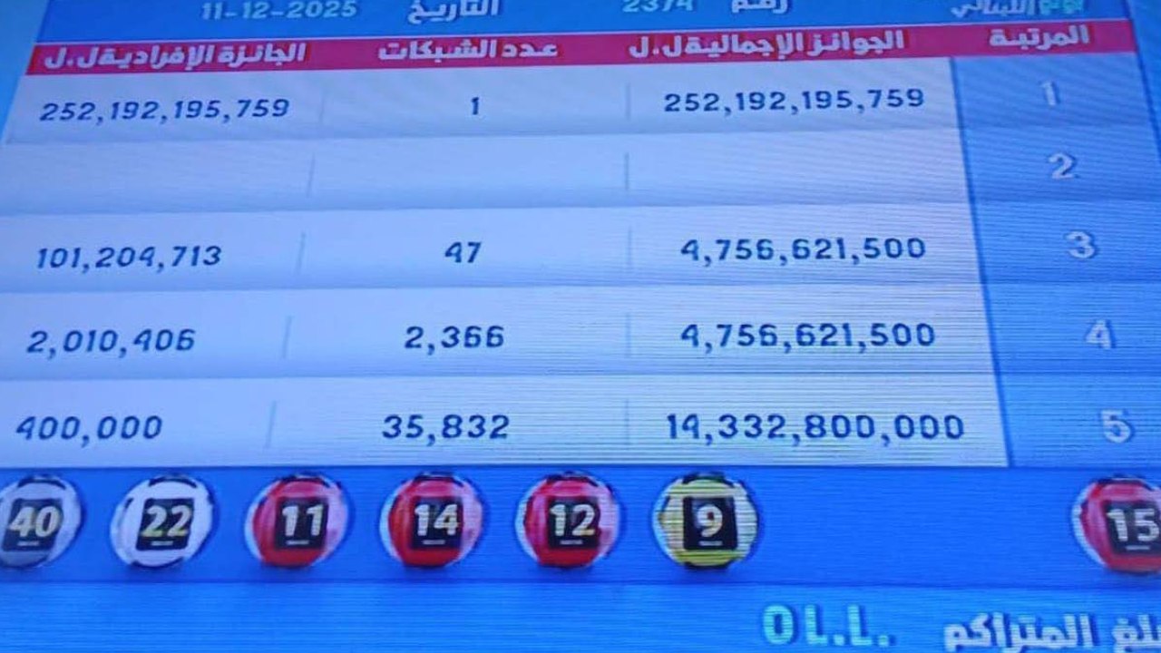 وأظهرت النتائج الرسمية أنّ الشبكة الرابحة حملت الأرقام: 40 – 22 – 11 – 14 – 12 – 9 مع الرقم الإضافي 15، ما جعل عطوي الفائز الوحيد بالجائزة الأولى، في سحب اعتُبر من الأكثر إثارة للمتابعة خلال الأشهر الأخيرة.