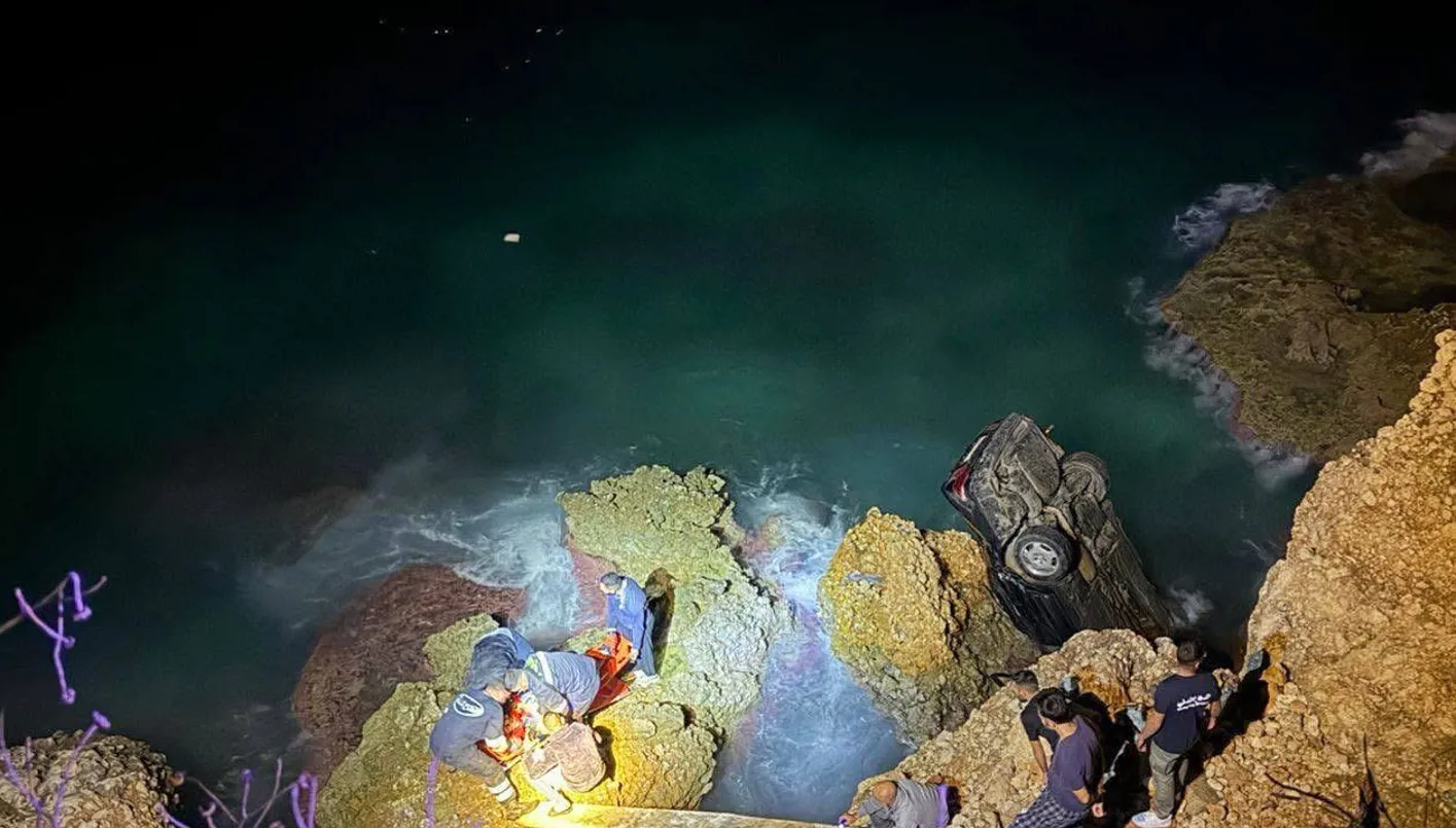 بالفيديو- 4 جرحى بانحراف سيارة على طريق شكا البحرية وسقوطها بين صخور الشاطئ