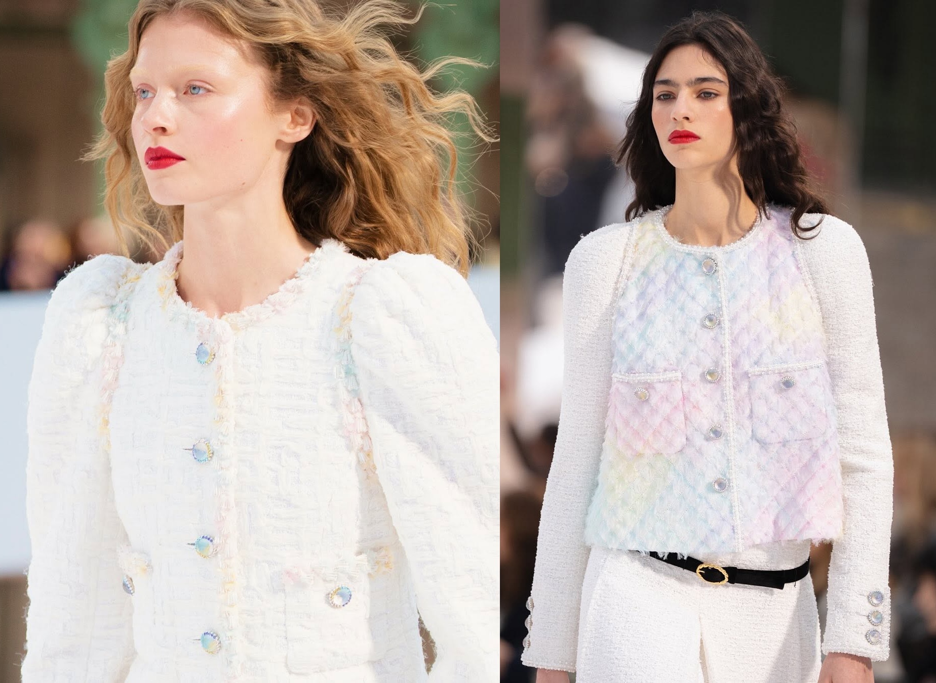 تُعيد دار CHANEL إحياء المكياج الفرنسي وتعتمده بشكل موحّد على العارضات. في التفاصيل، قامت خبيرة التجميل ليزا باتلر بتحديد خدود العارضات باستعمال بودرة الخدود باللون الأحمر الفاتح، مع إبراز الشفاه باللون الأحمر القرمزي.