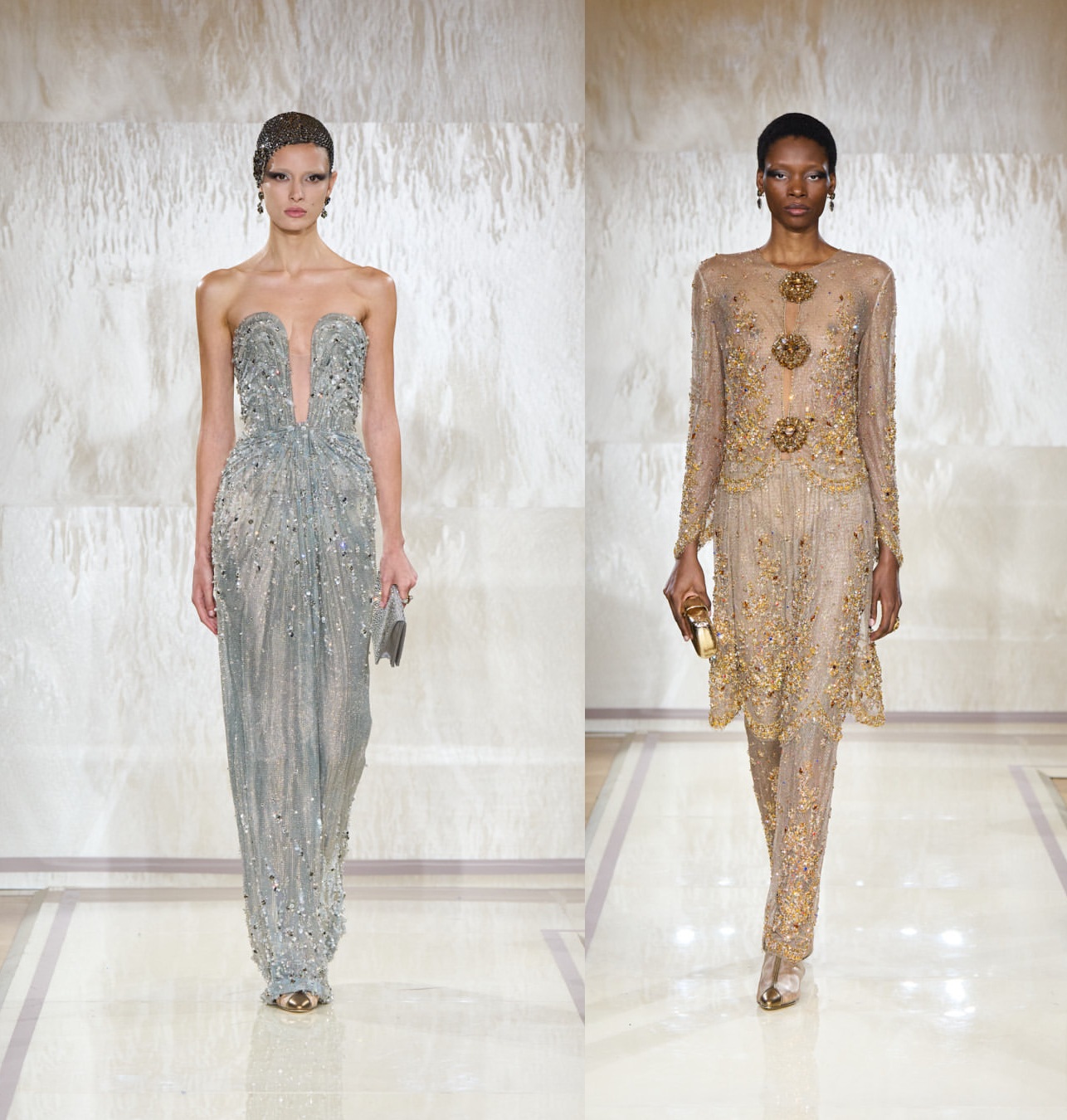 في حين تعتمد دور الأزياء العالمية المعايير المتطوّرة لتحقيق إطلالات العام 2025، اختارت دار جورجيو أرماني تقديم عرض مختلف يتبع المعايير الجمالية الخاصة بالعشرينيات، بحيث ظهرت العارضات بتسريحات الشعر المبلل مع مكياج دراماتيكي باللون الفضيّ.