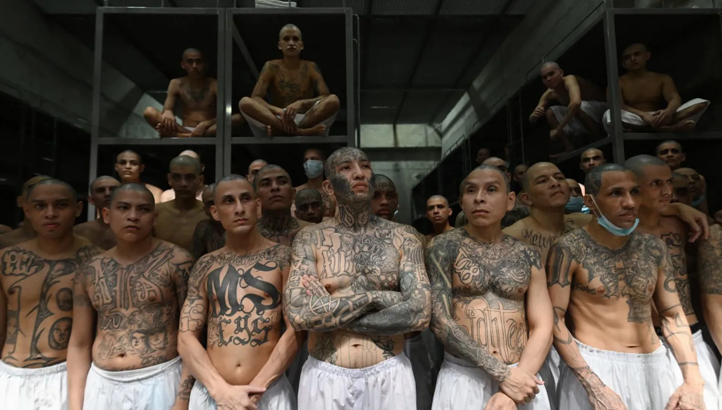 السجناء في زنزانة بمركز احتجاز مكافحة الإرهاب (CECOT) الضخم، حيث يُحتجز المئات من أعضاء عصابات MS-13 و18 Street، في تيكولوكا، السلفادور. (أ ف ب)