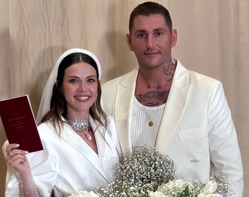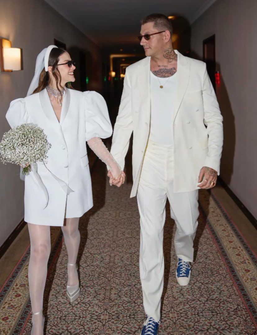 وارتدت الممثلة التركية فستاناً قصيراً أبيض اللون بأكمام نصفية قصيرة منفوخة عند الكتفين، ووضعت على رأسها طرحة بيضاء قصيرة، فيما أمسكت باقة من الزهور البيضاء بيدها. أما إطلالة العريس فكانت ببذلة رسمية باللون الكريمي وحذاء باللونين الأبيض والأزرق.